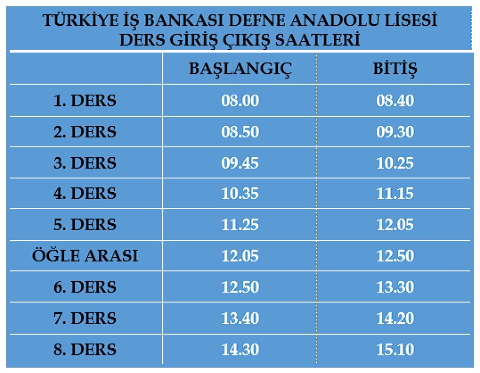 2025-2026 Eğitim-Öğretim yılında okulumuz ders giriş çıkış saatleri Ortaöğretim Kurumları Yönetmeliği gereğince aşağıdaki şekilde düzenlenmiştir.